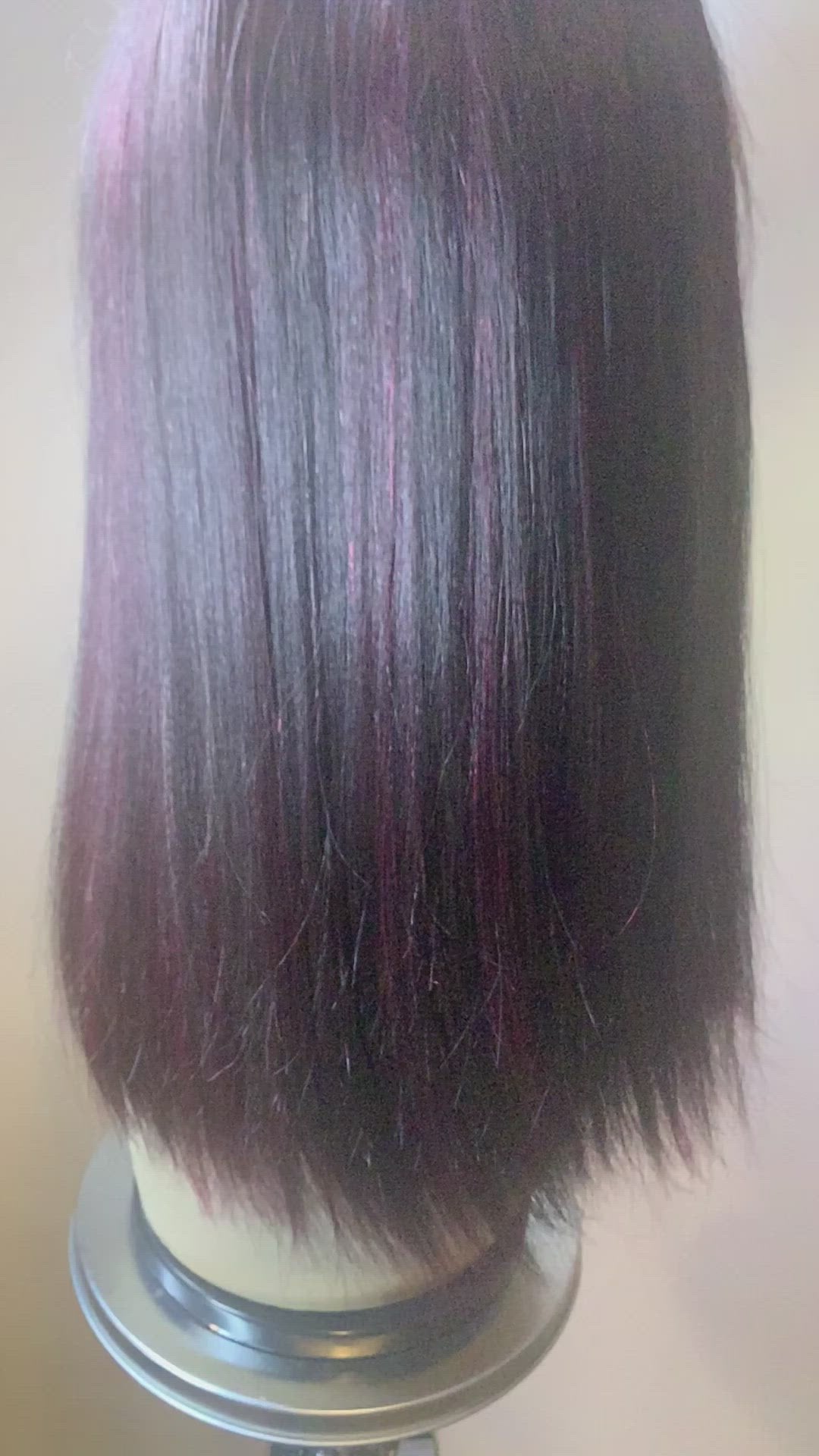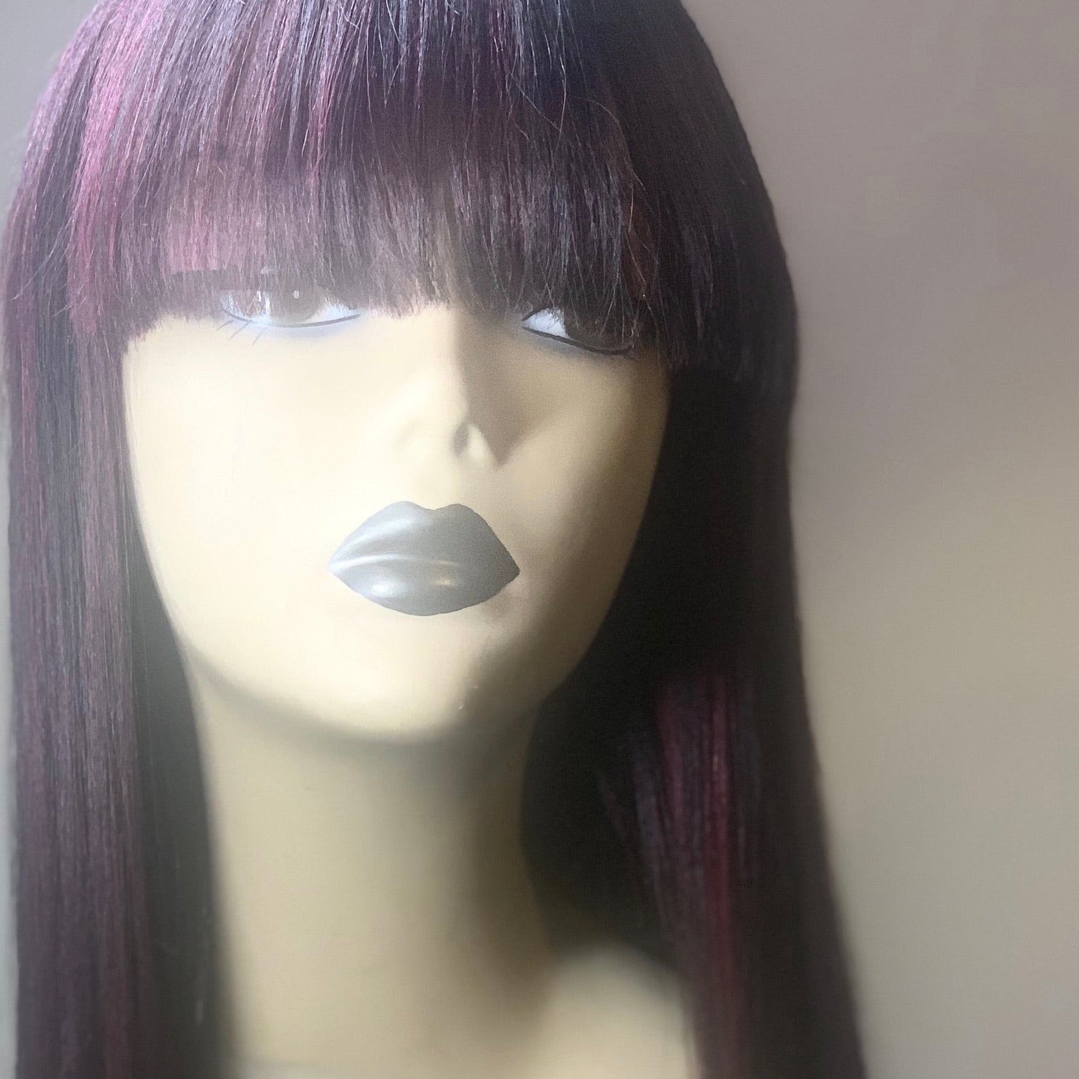 Long, cute bob with blunt yet natural bangs. 100% human hair. Tangle free.